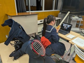 後半は、高岡高校生から、日本のことについて英語でプレゼンテーションを行いました。日本の観光地やスポーツ、アニメなど話題は多岐にわたり、中には、相撲について熱心に語る生徒や所属する剣道の防具を見せながら紹介する生徒もいて、大変盛り上がりました。インドの大学生からも熱心に質問がなされ、質疑応答も白熱しました。