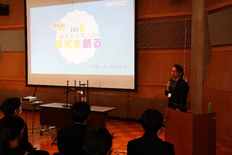 後半は、富山大学教育学部の宮城信先生より、「探究ガイダンスー探究を創るー」というタイトルでお話いただきました。探究活動の奥深さに不安を覚えながらも、これから「世界の法則」と「人間の不思議」に挑むという期待に溢れた時間となりました。