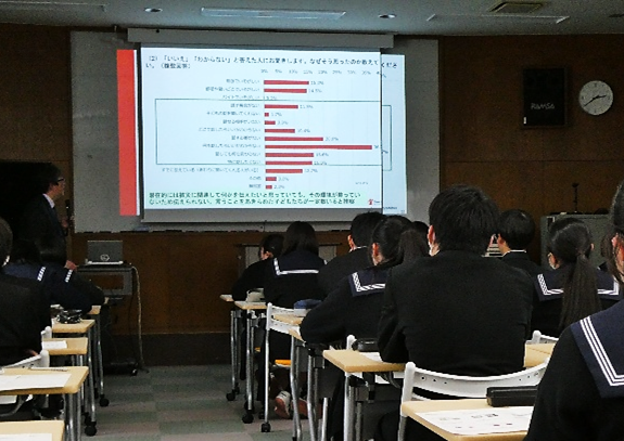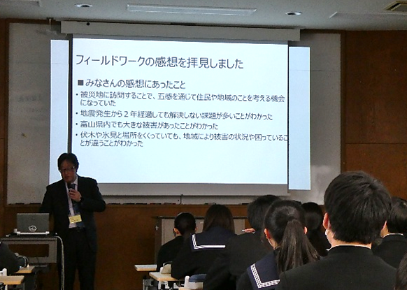 2年次人文社会科学科生徒は、富山大学人文学部教授の大西宏治先生より、「探究科学科(人文)の研究のあり方を考える」というテーマでお話をしていただきました。文系の調査方法やアンケート調査の仕方を実際の調査事例を用いて説明してくださいました。また、生徒らが12月の氷見伏木フィールドワークをもとに考えた研究課題に対して、班ごとにコメントをし、研究テーマに昇華させる際のポイントを教えてくださいました。